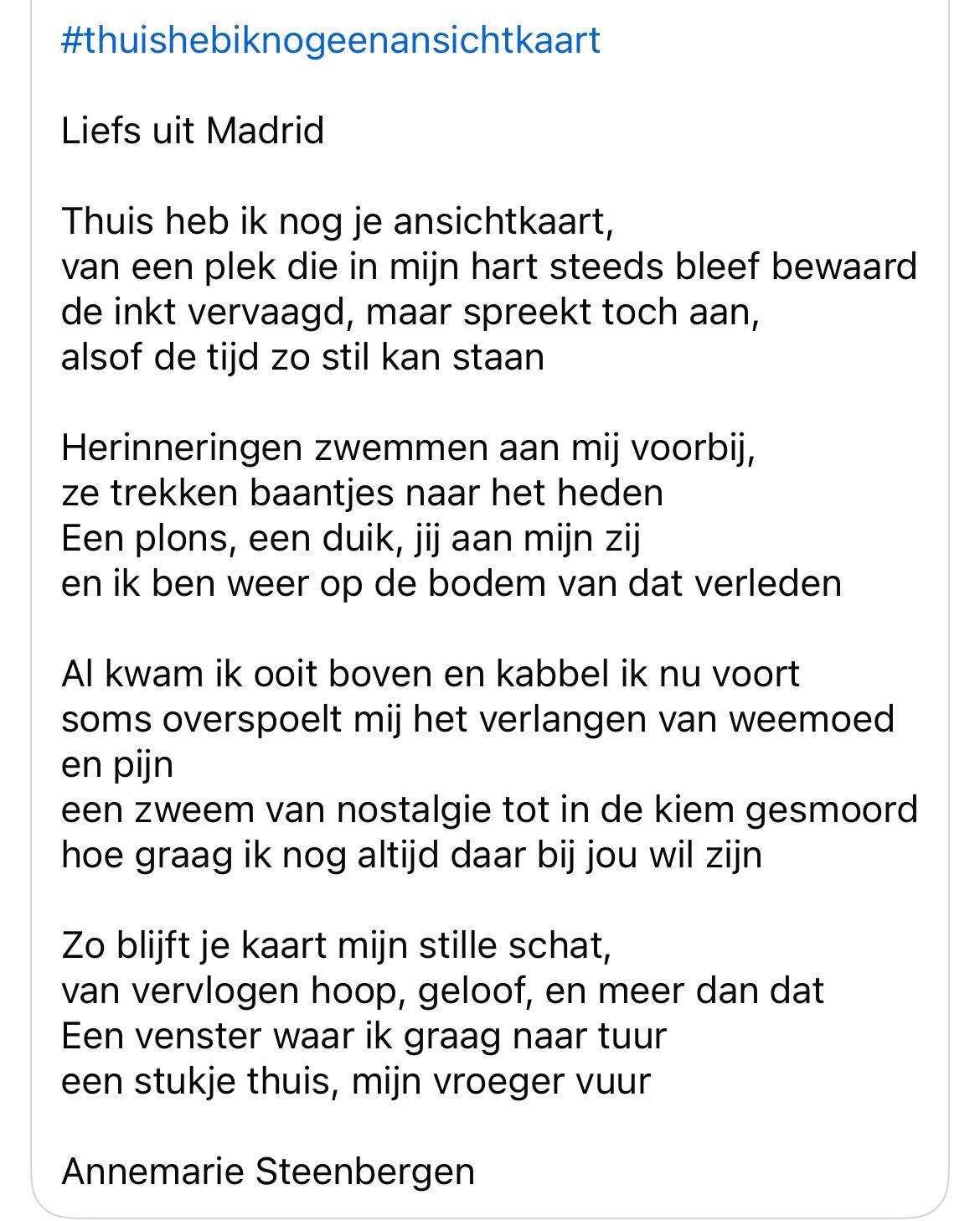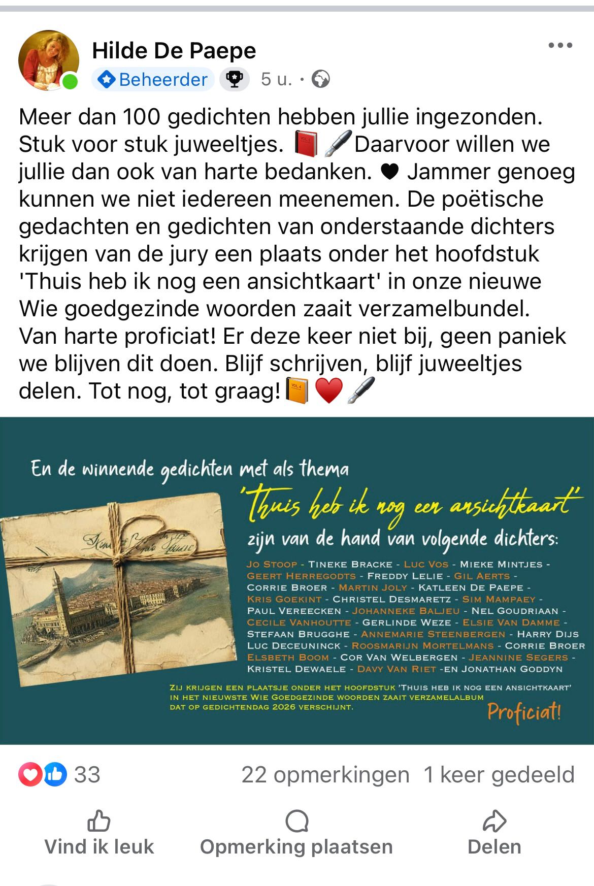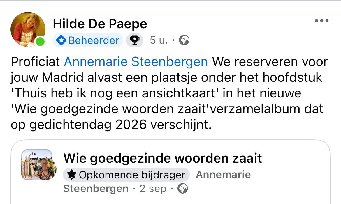 Op 26 september kreeg ik het fijne bericht dat mijn gedicht 'Liefs uit Madrid' is geselecteerd voor het hoofdstuk 'thuis heb ik nog een ansichtkaart' in de bundel 'Wie goedgezinde woorden zaait' dat in januari 2026 verschijnt. Muy feliz!