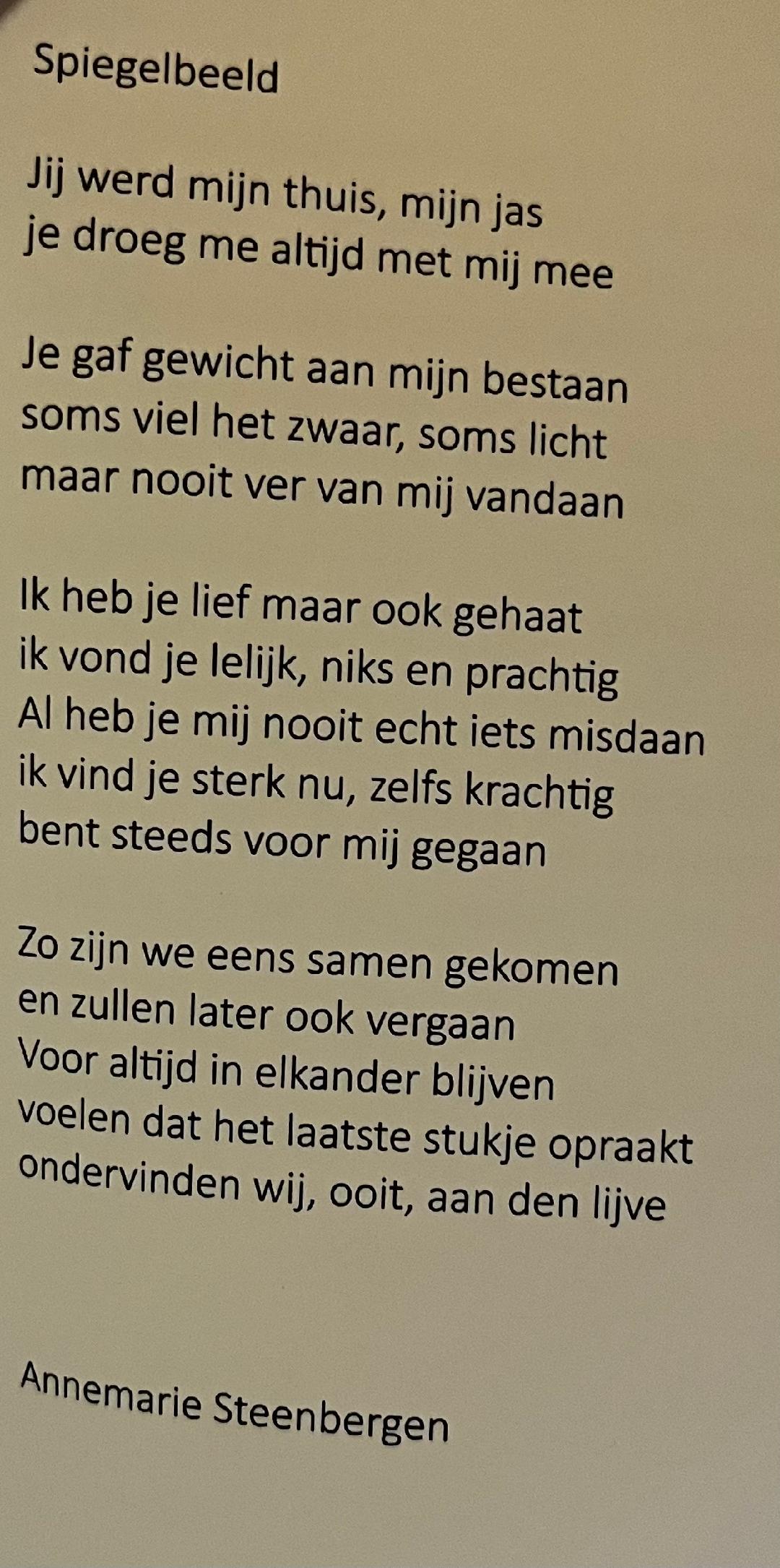 Mijn gedicht 'Spiegelbeeld' is opgenomen in de dichtbundel 'lijfelijkheid' van Borne doet Poëzie. De Bornse bundel is uitgegeven in het kader van de poëzieweek 2025 met als thema 'lijfelijkheid' en is daarom niet te koop.